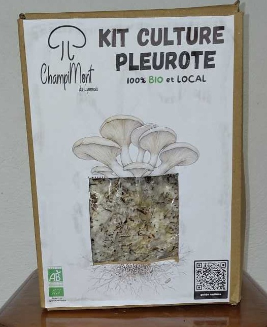 Kit de culture de pleurotes pour faire pousser ses propres champignons à la maison, c'est très facile et ça fonctionne très bien à l’intérieur d'une maison. Le kit est fabriqué dans les Monts du Lyonnais uniquement avec des matériaux bio et locaux (paille, bois) de façon artisanal. Le kit permet de produire plus d'un kilo de champignons en 3 récoltes.